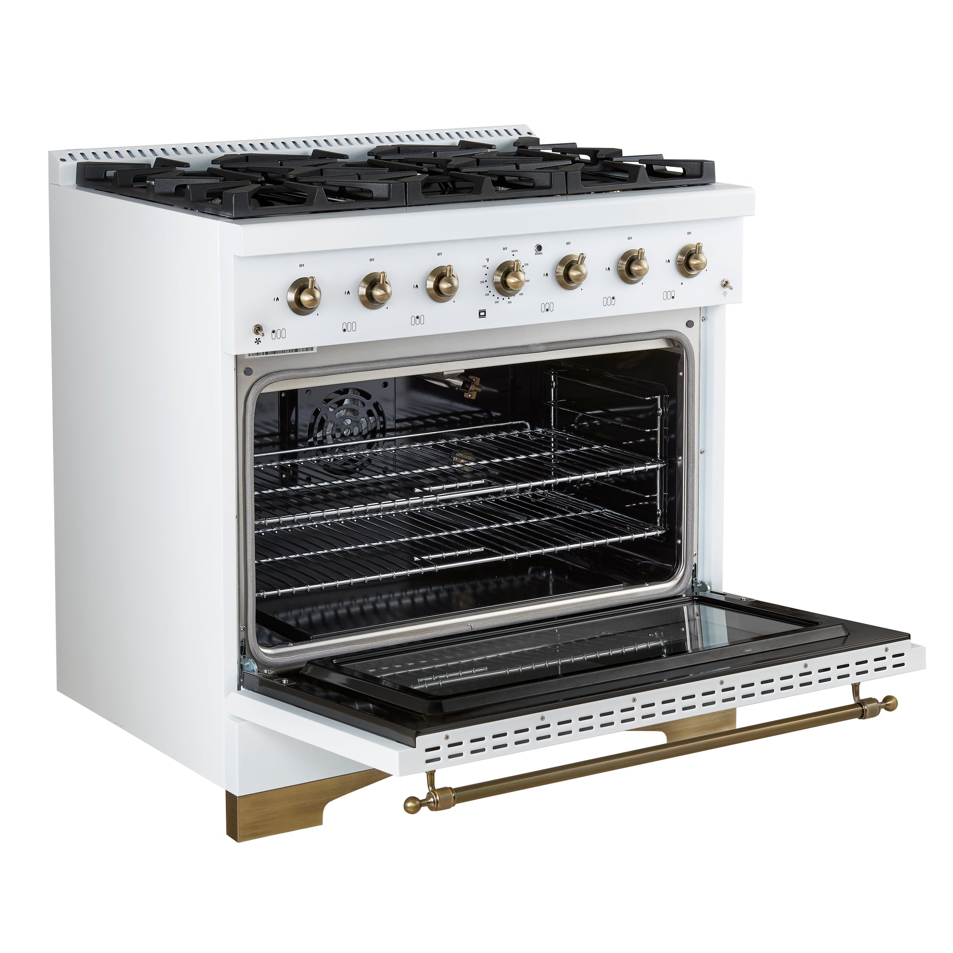 Forno Antico 36-Inch Freestanding Gas Range, White, Antique Brass Design, 6 Burners, Convection Oven, Energy Efficient