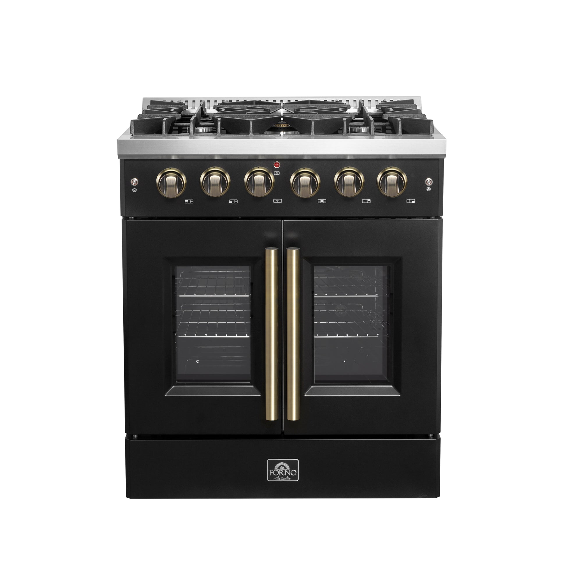 Forno Galiano 30-inch French Door Gas Range Black and Antique Brass Design, 5 Sealed Burners 68,000 BTU, 4.32 cu.ft. Convection Oven