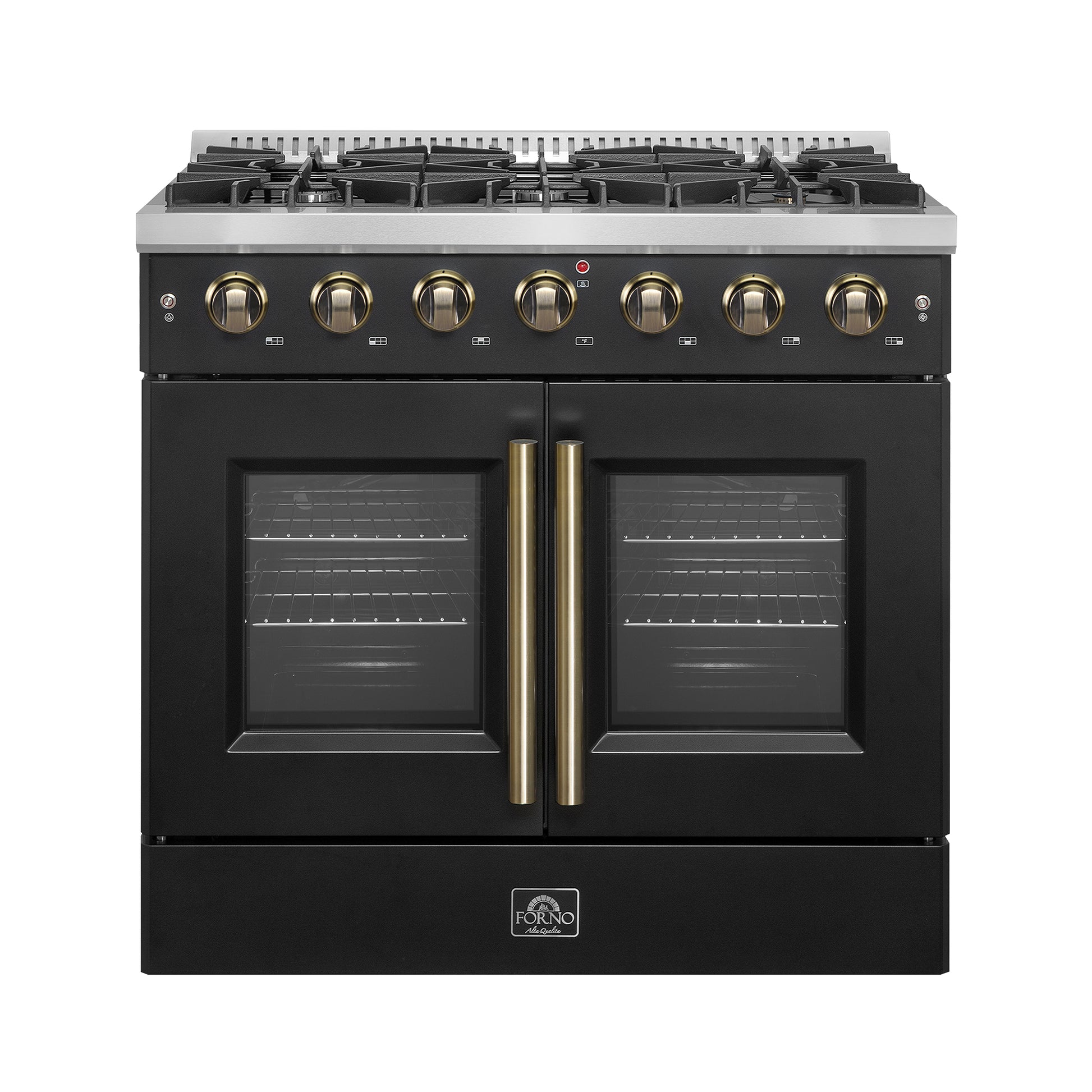 Forno Galiano 36-inch French Door Gas Range Black and Antique Brass Design, 6 Sealed Burners 83,000 BTU, 5.36 cu.ft. Convection Oven
