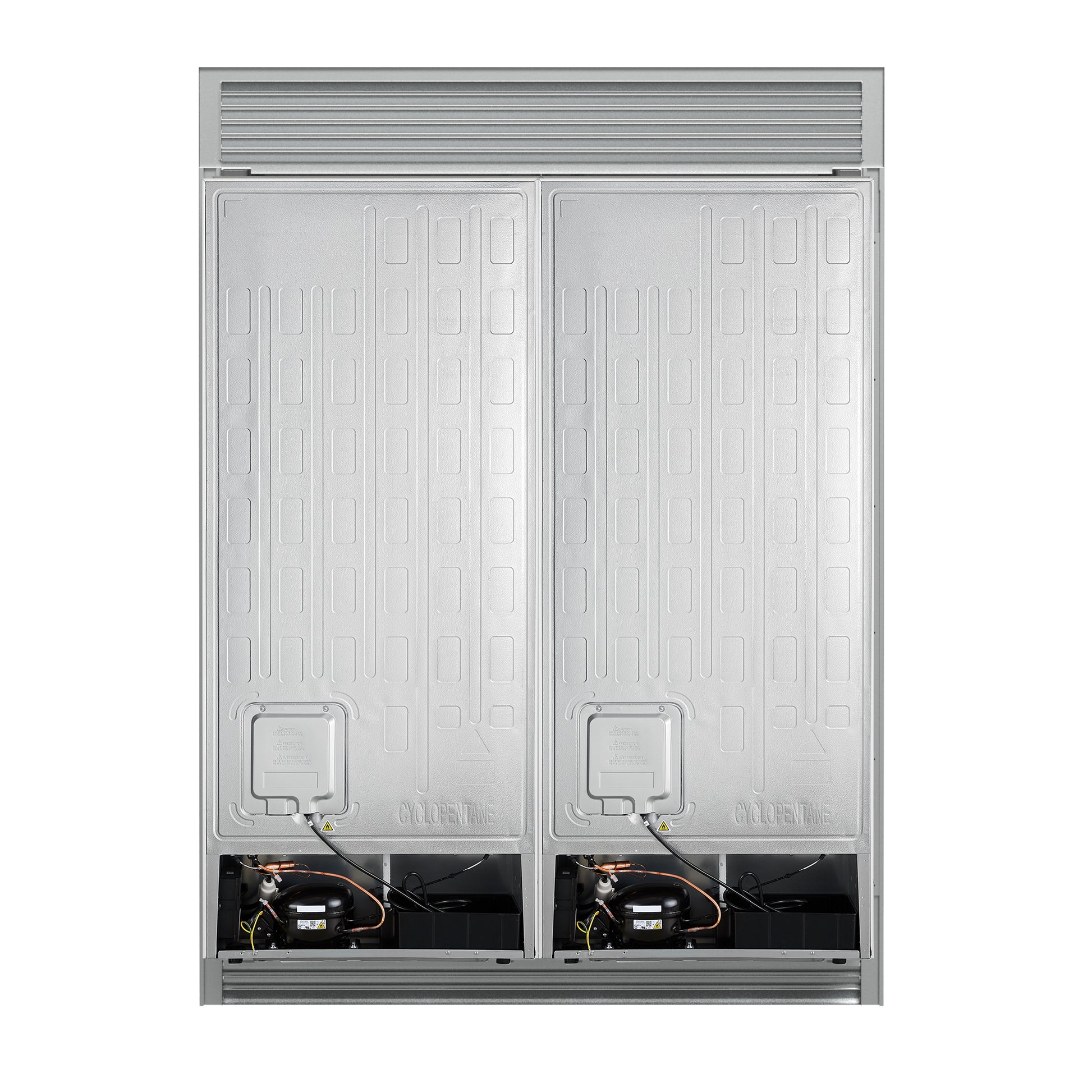 * Both 28-inch refrigerator/freezers with decorative trim grill extends to a width of 60 inches, giving it the appearance of a built-in refrigerator.